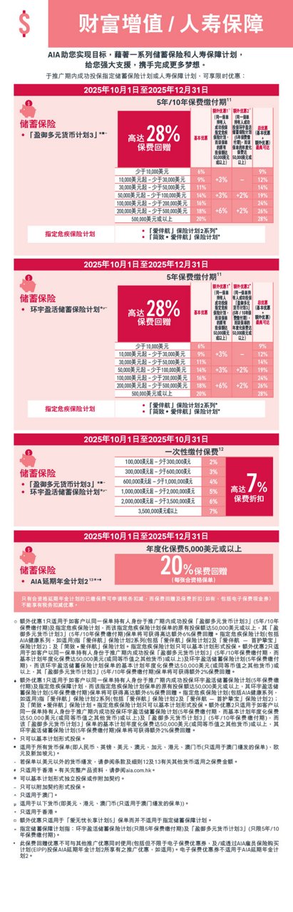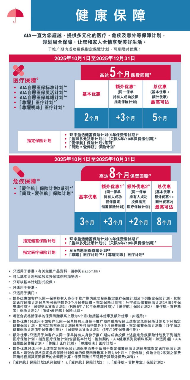 此网页只供于香港/澳门浏览。本网页只载有一般资料,并不构成任何销售建议及/或有关产品之推介。于投保保险产品之前,客户须完成财务需要分析。所有此网页中的 产品资料只供参考,并不包含保单的完整条款。有关产品特点、条款及细则、不保事项及主要产品风险之详情,请参阅相关产品之产品简介及保单契约。如欲在投保前参阅保险合约之样本,您可向AIA索取。人寿保险保单属长期的保险合约。如于早年退保,您所收取的金额可能大幅 少于已缴的保费。