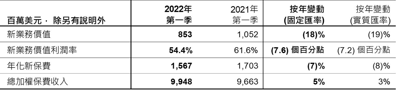 儘管大量的2019冠狀病毒病感染個案在2022年第一季導致大規模社交距離措施及干擾經濟活動,惟我們中國內地以外的報告分部整體表現強韌,新業務價值只較2021年第一季的卓越業績下跌8%。