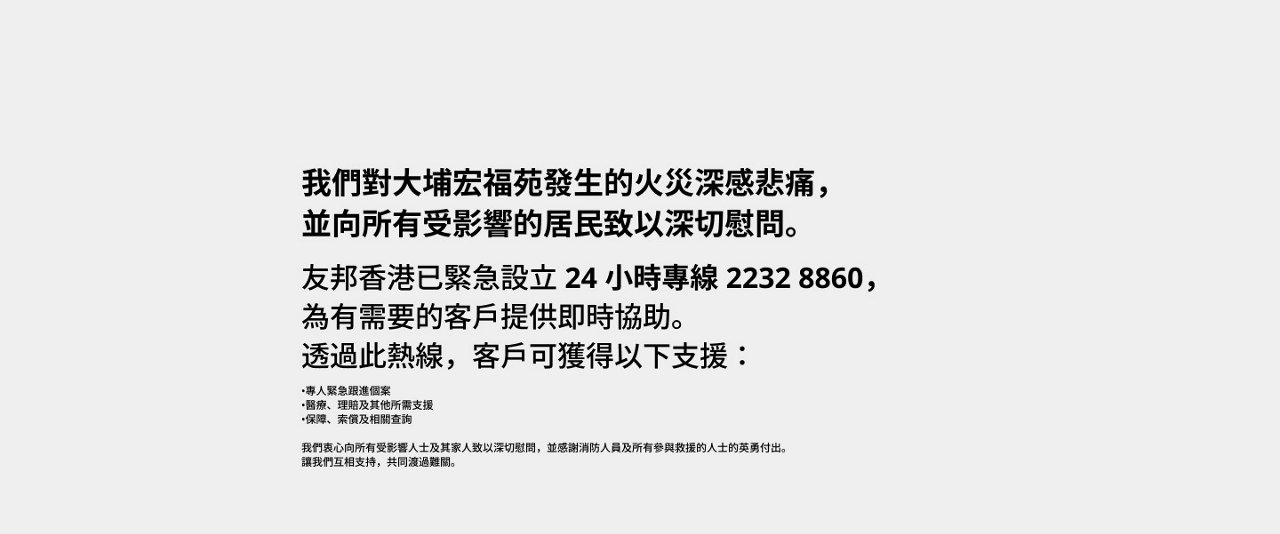 提防詐騙: 友邦香港已登記為香港通訊事務管理局辦公室(OFCA)認證的短訊發送人,我們發送至香港本地流動服務用戶的短訊發送人名稱均會以「#」號開頭。同時請留意由其他渠道如假冒網站、手機應用程式、電郵和來電等發出或接收的可疑信息。在任何情況下,切勿點擊可疑連結及披露個人資料,以免蒙受損失。如有懷疑,請聯絡客戶熱線: 香港 (852) 2232 8888 或澳門 (853) 8988 1822。詳情請按此。