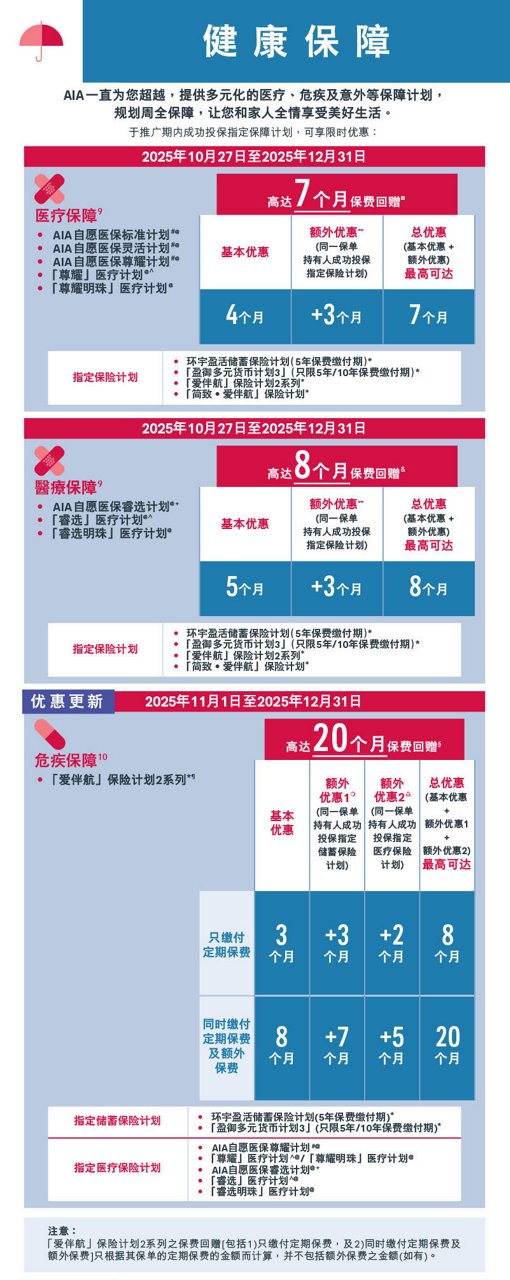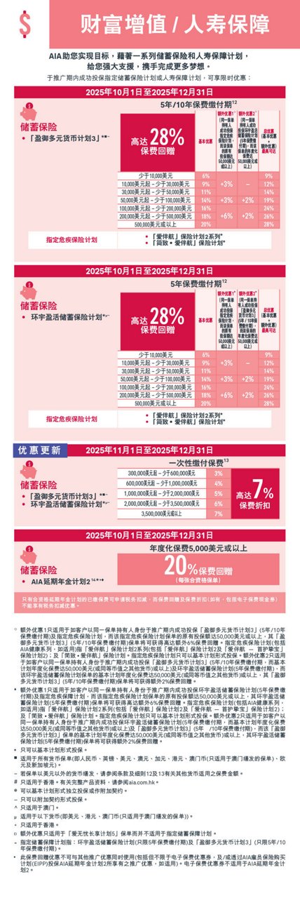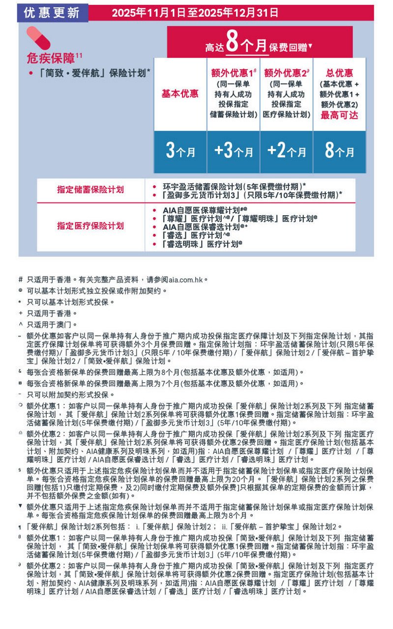 此网页只供于香港/澳门浏览。本网页只载有一般资料,并不构成任何销售建议及/或有关产品之推介。于投保保险产品之前,客户须完成财务需要分析。所有此网页中的 产品资料只供参考,并不包含保单的完整条款。有关产品特点、条款及细则、不保事项及主要产品风险之详情,请参阅相关产品之产品简介及保单契约。如欲在投保前参阅保险合约之样本,您可向AIA索取。人寿保险保单属长期的保险合约。如于早年退保,您所收取的金额可能大幅 少于已缴的保费。