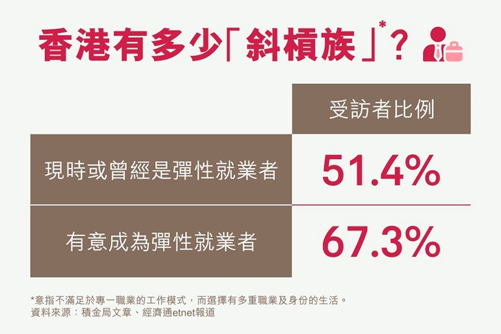 為了尋找人生新機遇,現在不少人會在同一時間嘗試不同的機會,開拓自己的職業道路,也爲日後華麗轉身「做老闆」累積經驗。究竟香港有多少人正嘗試「斜槓式(slasher)」自主創業呢?